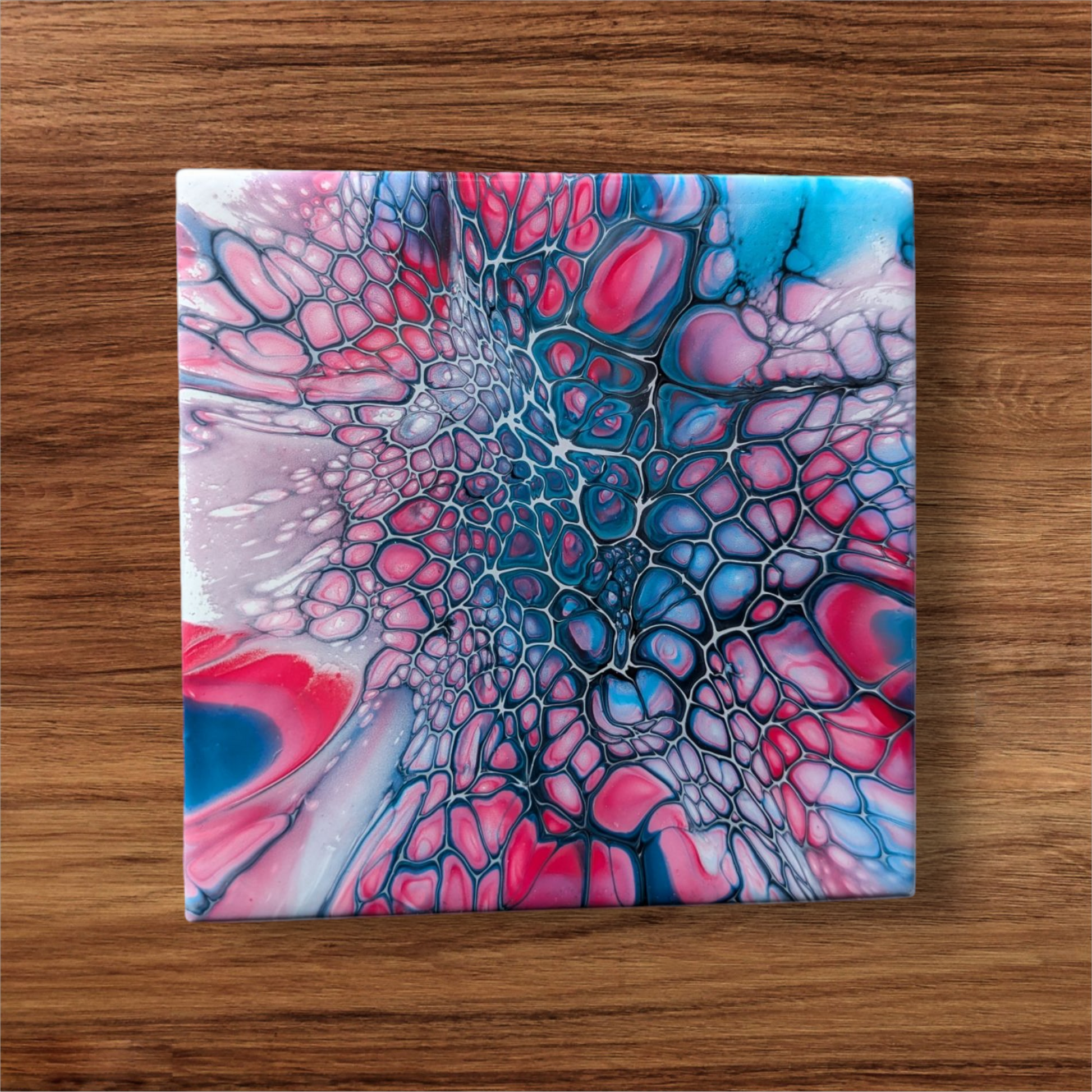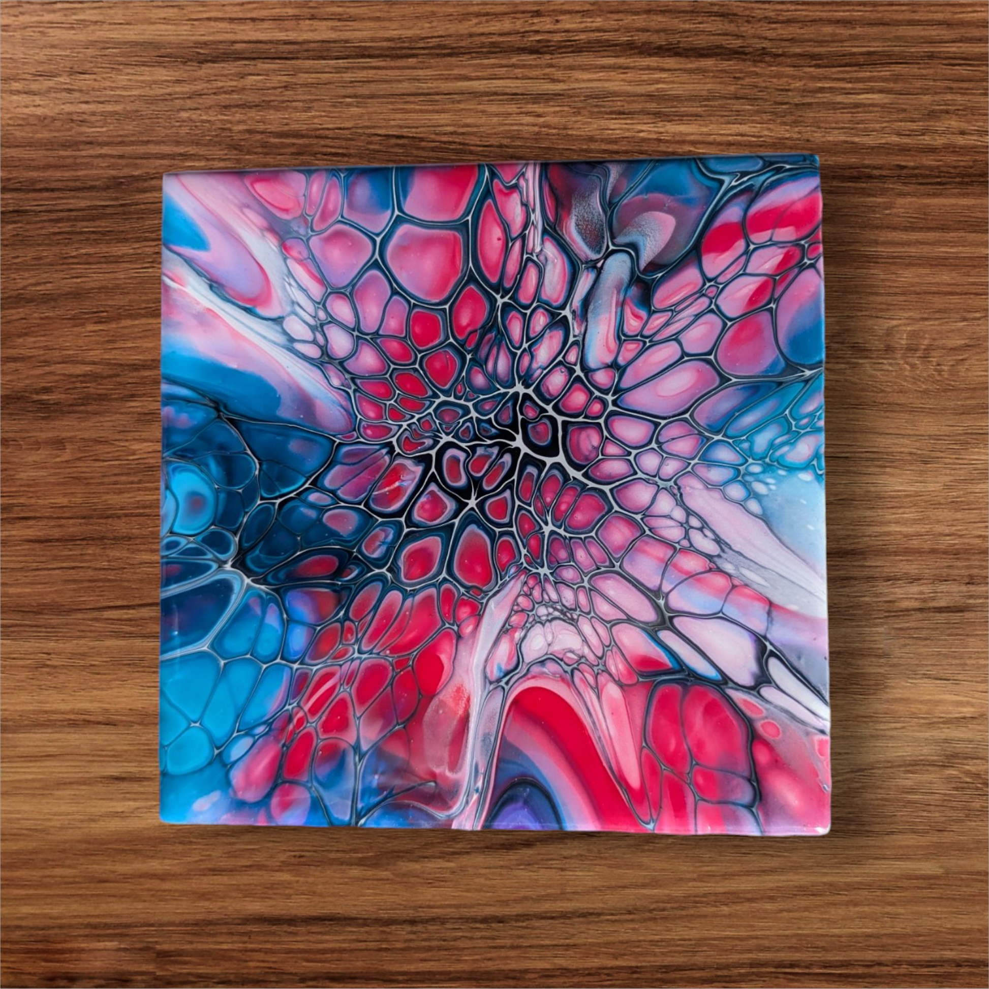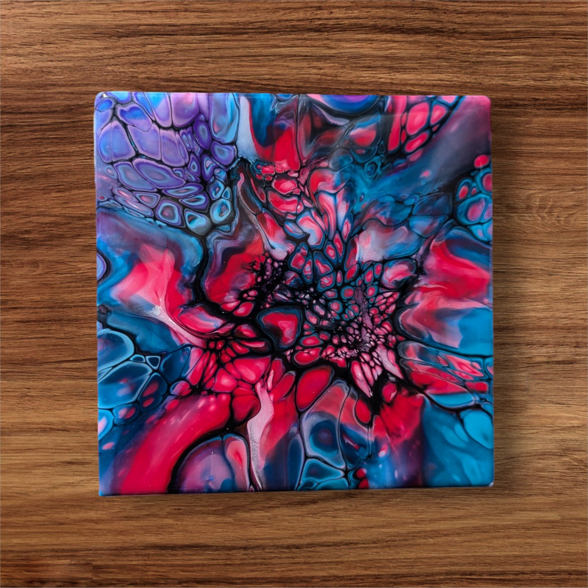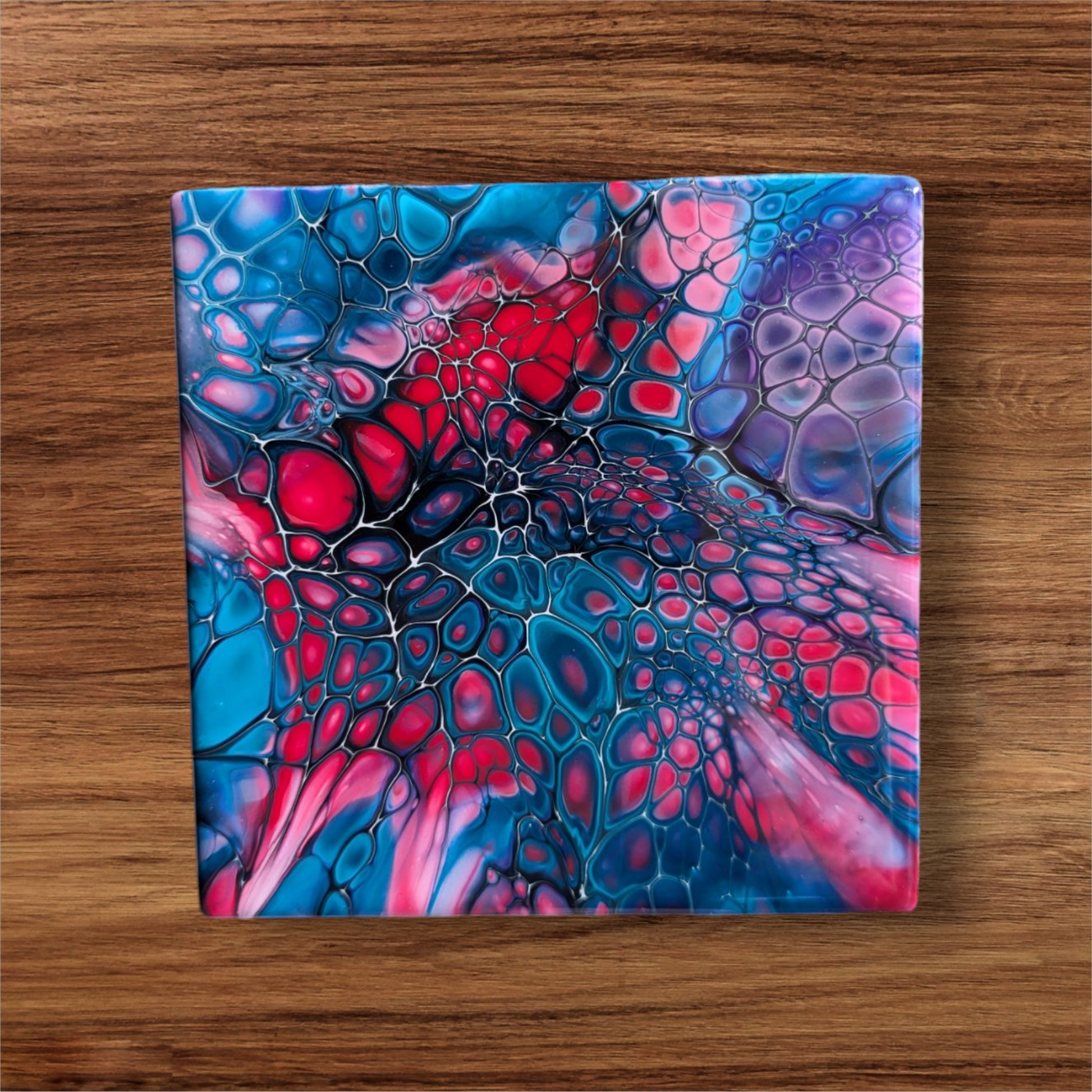 Add a touch of modern artistry to your home with our unique 4x4 ceramic coasters. Each one-of-a-kind piece boasts a dynamic red, white, and blue abstract pour, captured under a brilliant, crystal-clear resin finish. This not only magnifies the rich colors but also provides exceptional durability. Complete with a protective felt backing, these coasters are both beautiful and functional, ideal for any occasion or everyday use.